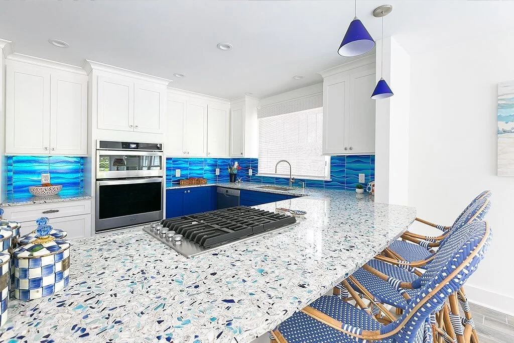 Charleston Home + Design Magazine nominated GlassEco Surfaces for a 2021 Top 10 Award for this kitchen’s recycled glass countertops. During our client’s design consultation, we selected glass to complement the vibrant colors of the backsplash tile that they planned to use for their Kiawah Island new construction. Photo credit: Patrick Brickman