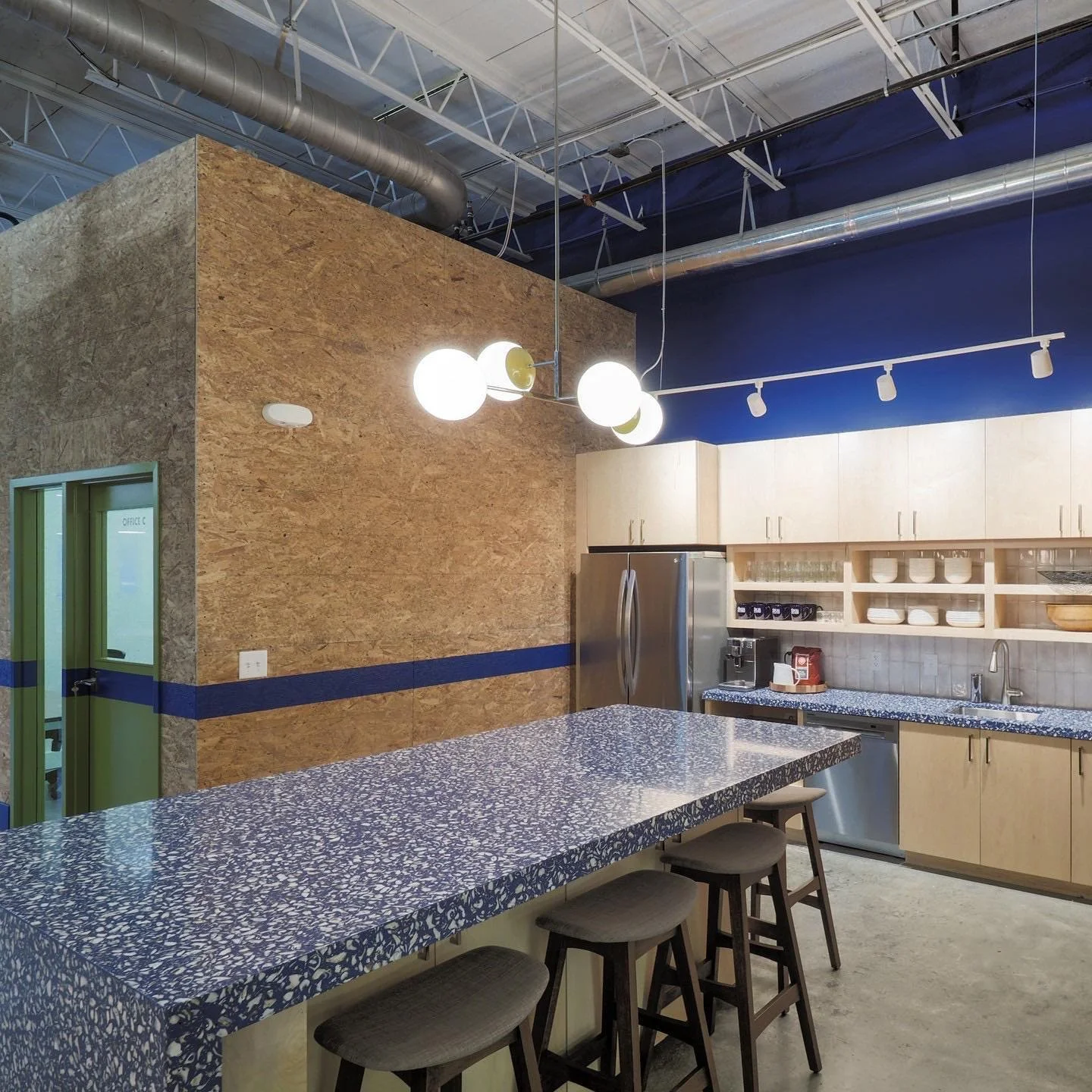 When outfitting their original Local Works space in 2014, Lowcountry Local First (LLF) selected GlassEco countertops for the kitchen design. After loving the uniquely local product, they decided to work with us again for their expanded co-working space in 2021. LLF chose a base color of Dignity Blue to mix things up in their new kitchen!